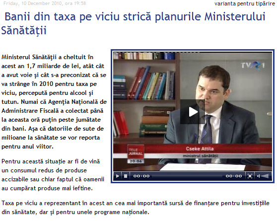 În știrea de mai jos veți vedea cum un redactor de la TVR interpretează niște cifre cu o logică devastatoare: plecînd de la o eroare și continuînd cu o dezinformare, ajunge ca, în finalul știrii, să acrediteze ideea că vinovați pentru că nu s-au colectat accizele pe țigări și alcool sînt tocmai românii, care nu au consumat cît a gîndit Ministerul Finanțelor!
