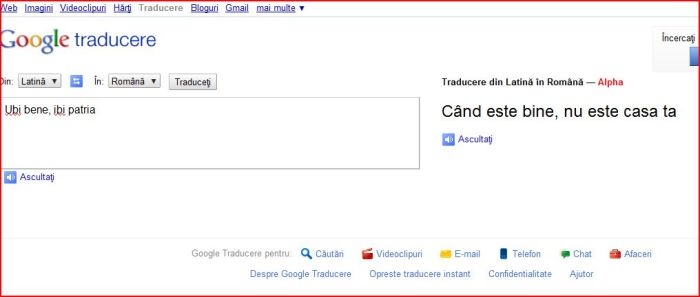 Ei bine, la o altă zicere celebră, tot mai actuală în contextul liberalizării circulației forței de muncă în UE, Google Translate mi-a rezervat o surpriză metafizică. La Ubi bene, ibi patria, aplicația mi-a returnat echivalentul românesc potrivit căruia Când este bine, nu este casa ta (clic pe foto pentru mărire)!