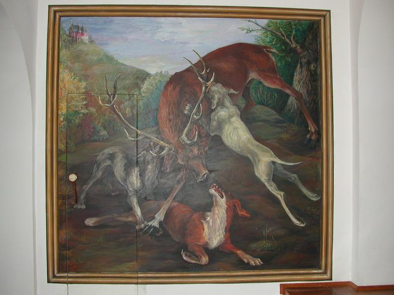 Pe respectivul perete, mascînd ușa totodată, am pictat o fresca cu tema vînătorească. Mi s-au adus albume din Franța cu picturi celebre cu scene de vînătoare, fotografii ale lui Ion Țiriac ca vînător, de peste tot din lume, cu emirul Qatarului, cu Adrian Năstase la vînătoare de potîrnichi, cu alte mari personaje, la vînătoare de mufloni… În final am pictat o scenă clasică, un cerb încolțit de trei cîini, iar în fundalul picturii, mi s-a cerut să se vadă și castelul.