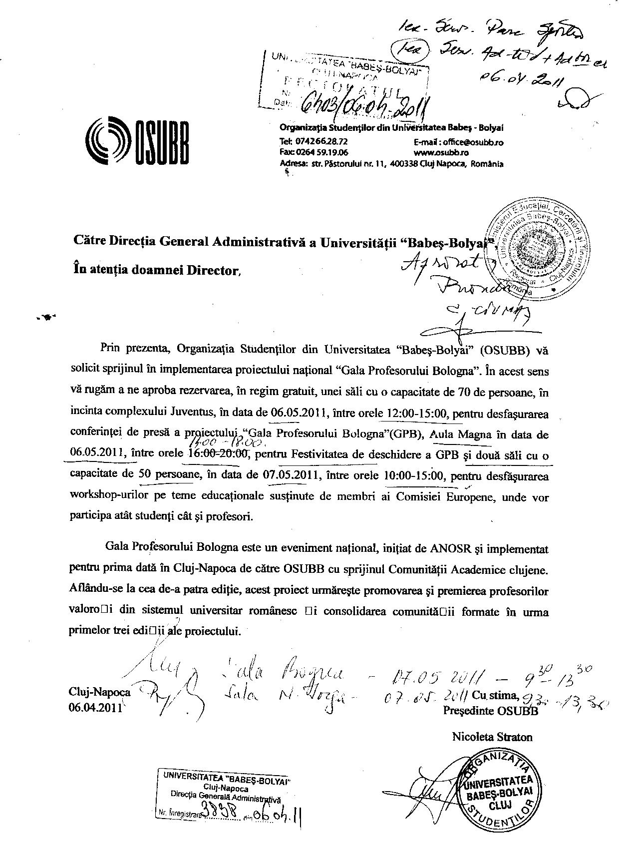 – Am prezentat documentele de revocare a cererilor adresate UBB de către OSUBB, subliniind data primirii acestora, şi anume 29 aprilie, respectiv 2 mai, anul curent, proiectul având ca date de desfăşurare 6 şi 7 mai 2011.