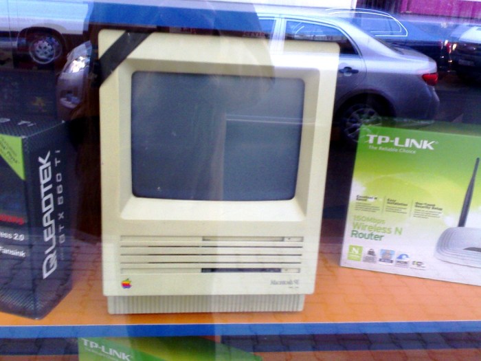 Fotografia a fost făcută sâmbătă dimineața și surprinde imaginea vitrinei unui magazin de calculatoare și componente de calculatoare din centrul Clujului.