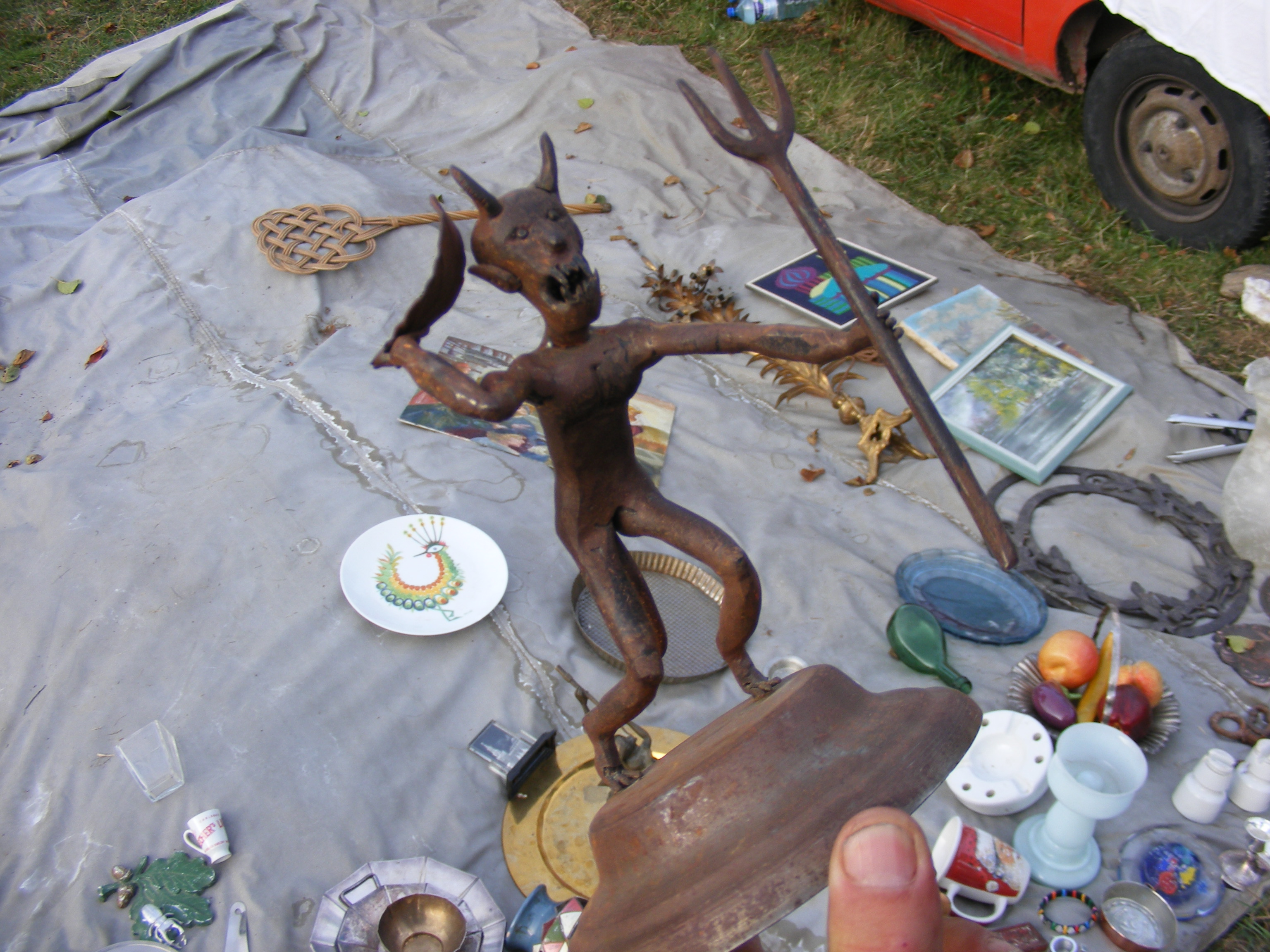Am un drac aici, e singurul din târg! Vedeți, are și mușchiuleț și dinți și furcă! Cer cincizeci de euro pe el, dar parcă nu l-aș da, e Dracul târgului!