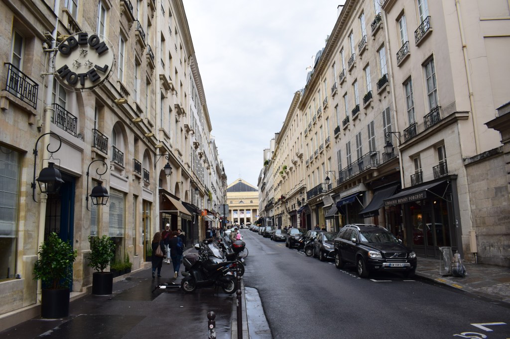 Rue de l’Ancienne Comédie, cu cafeneaua Le Procope, Marais, acum înțesată cu bistrouri unde se mănâncă sushi, Saint Germain, treci de restaurantul Danton, bulevardul se bifurcă în două străduțe – una este Rue de L’Odeon. E o stradă scurtă. Peste vitrine sunt trase deja obloanele, dar dincolo de grilajele metalice poți să numeri nu mai puțin de nouă librării. Zăbovesc fascinată în fața fiecăreia, ca un copil în fața galantarului cu bomboane. Colecții întregi de carte veche, dar și carte nouă, librării de autor, librării generaliste, o librărie e toată strada.