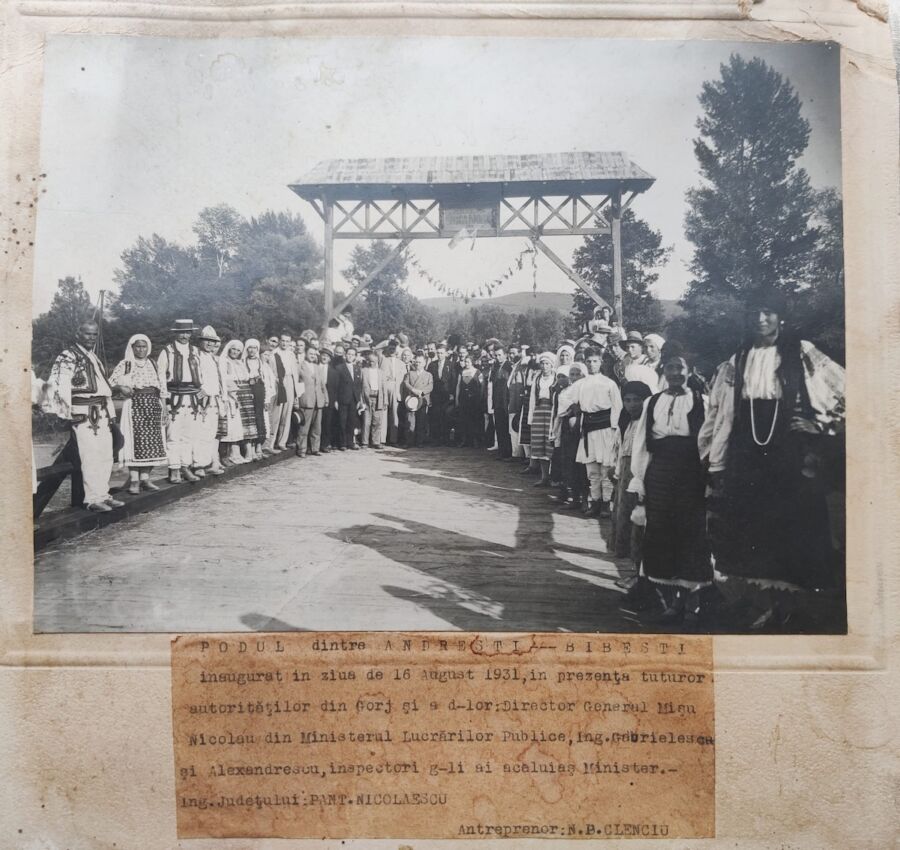 Altele sunt desculțe. Se uită încruntați la obiectiv, parcă le-ar intra soarele în ochi. S-au așezat sub poarta de intrare în sat, ridicată la capul podului de lemn, primul lor pod peste Gilort. Pe ea au trecut numele podului, anul și titularul lucrării, Ministerul Lucrărilor Publice.