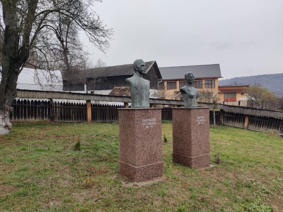 Într-un colț de curte, lângă gard, două busturi straniu așezate pe socluri de gresie marmorată: Gheorghe și Aretia Tătărescu privesc spre uliță, stingheriți și ei de întâmplarea de a fi aici.