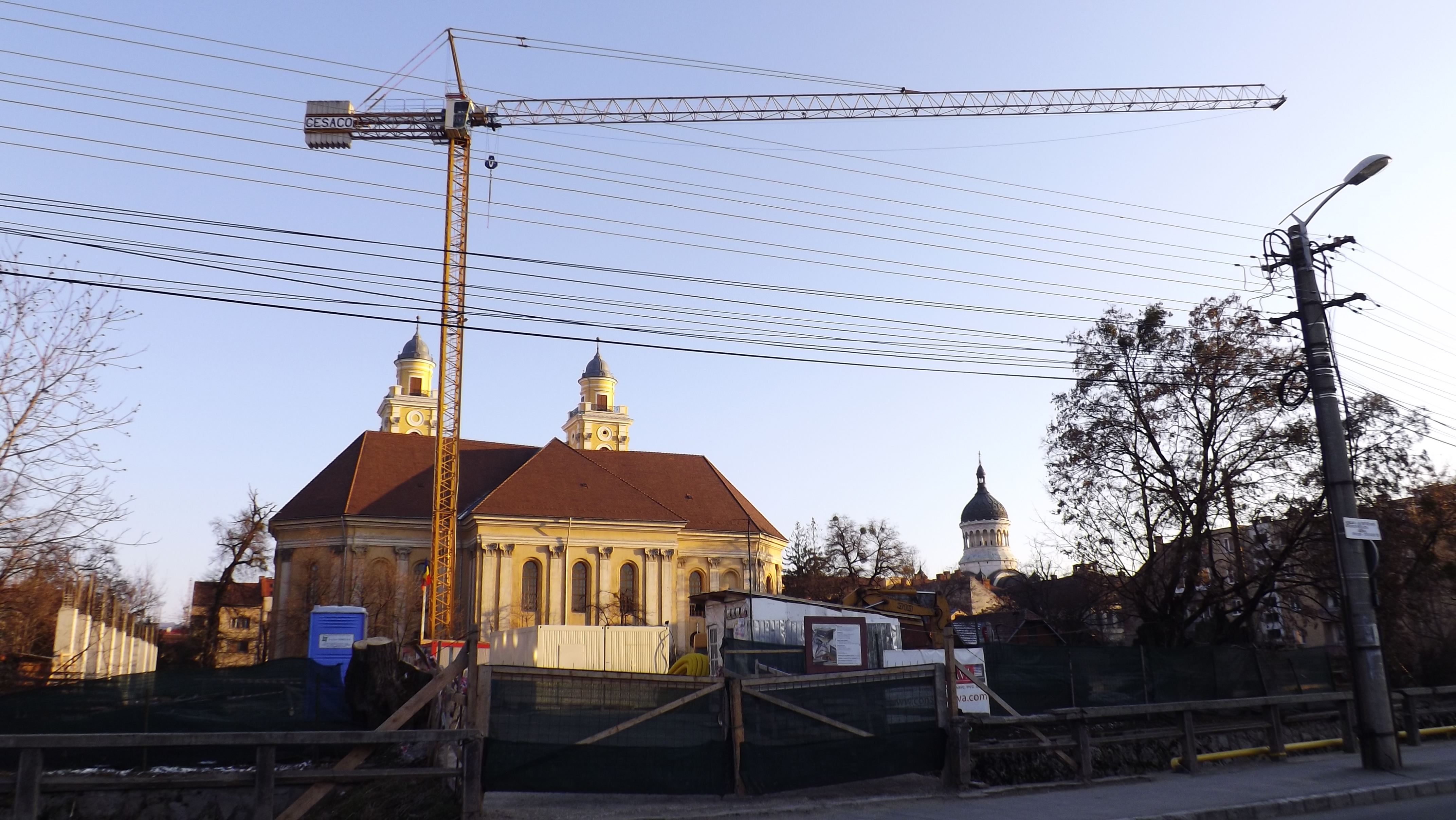 UPDATE: Duminică, 26 mai, în curtea Bisericii Reformate cu Două Turnuri de pe strada 21 Decembrie nr 41 va avea loc o manifestare de protest împotriva construirii sediului ISJ și a sălii de sport în apropierea bisericii. Asta pentru că negocierile nu au demarat, iar constructorii s-au întors pe șantier.