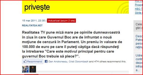 Sorin Ovidiu Vîntu a schimbat modul de a face politică la televiziunea sa. Nu-i mai folosește pe moderatori, ci pe telespectatori. E o televiziune inter-activă. Acum oferă 100 de mii de euro pentru cel mai bun răspuns (cine hotărăște asta, nu se știe!) la întrebarea: „Care este motivul principal pentru care guvernul Boc trebuie să plece?”