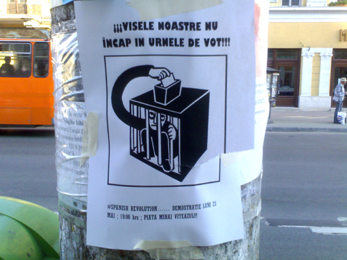 La noi, văzînd că mămăliga nu explodează, cei mai nervoși dintre opozanți atacă pe la spate. Orașul Cluj a fost împînzit de afișe în care oamenii sînt chemați astă-seară în Piața Mihai Viteazu. Sînt chemați la miting cu mesajul „Visele noastre nu încap în urnă”, dar fără ca cineva să-și revendice inițiativa. Citește în continuare „Revoluția spaniolă din Piața Mihai Viteazu începe la ora 7, seara”